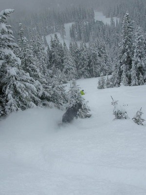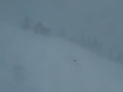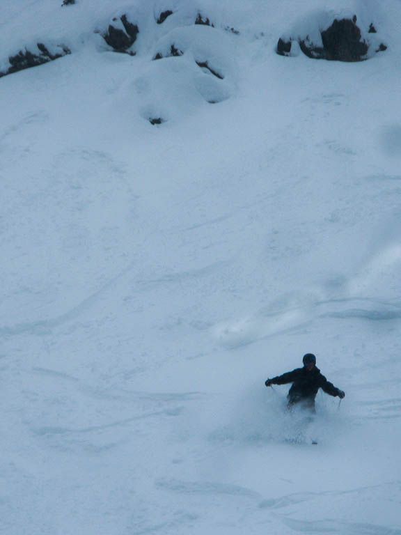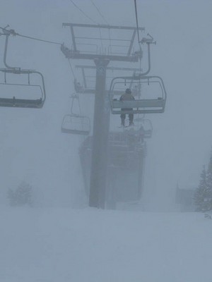 A sick day today. Over 20cms last night, it’s still snowing, the wind loaded it up DEEP on the lee slopes, and the lift opened 20 minutes early. Conditions were savage though. Cold, foggy, windy. I felt like I was landing on Utah beach on June 6th or something coming up for my first run.