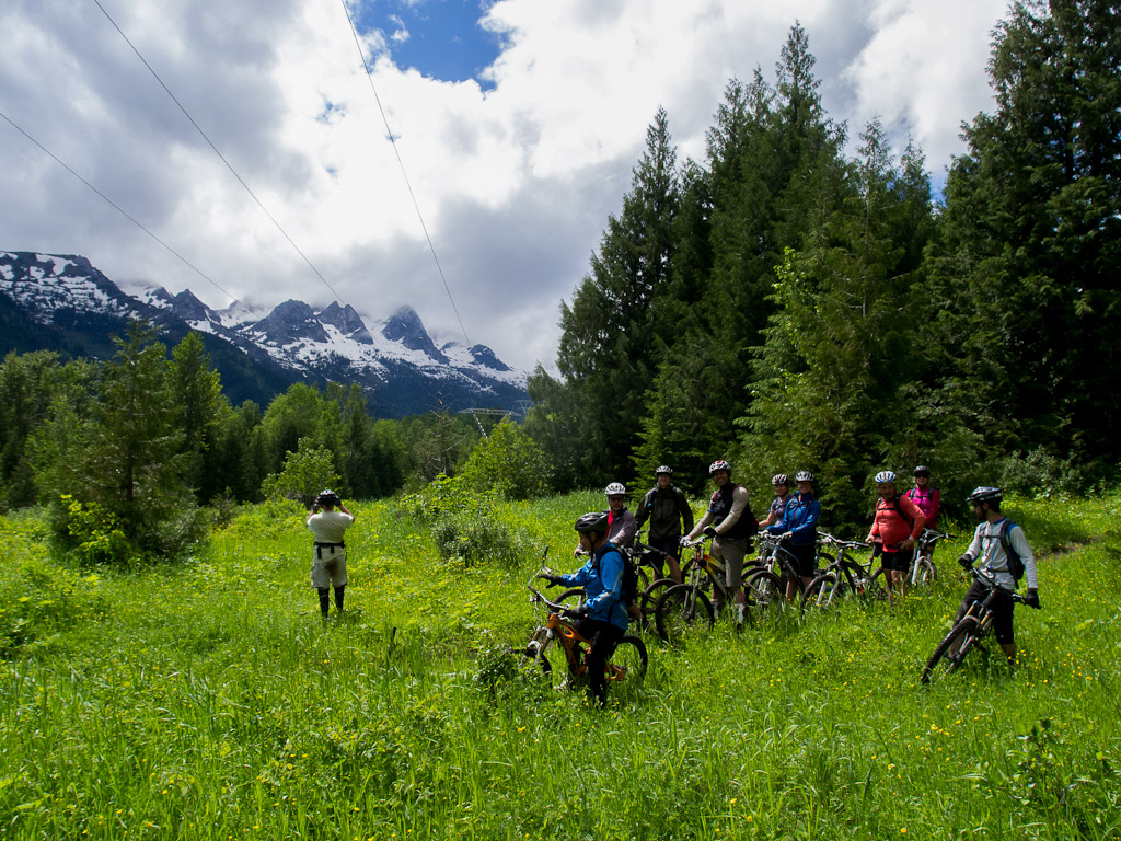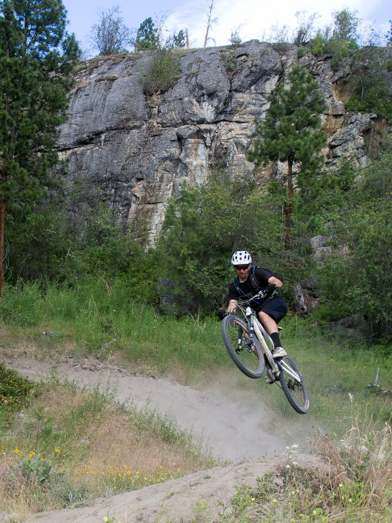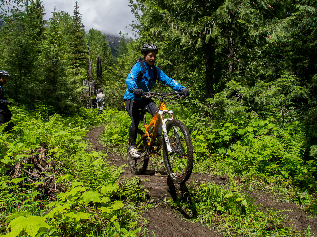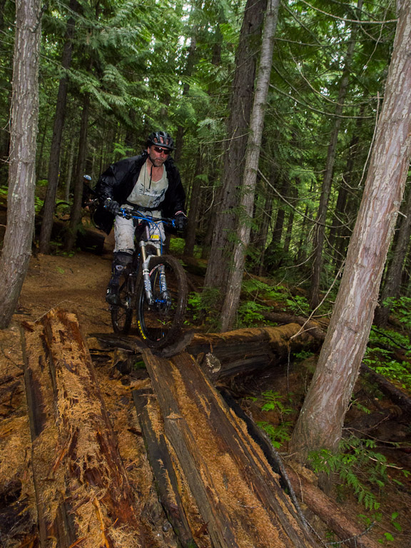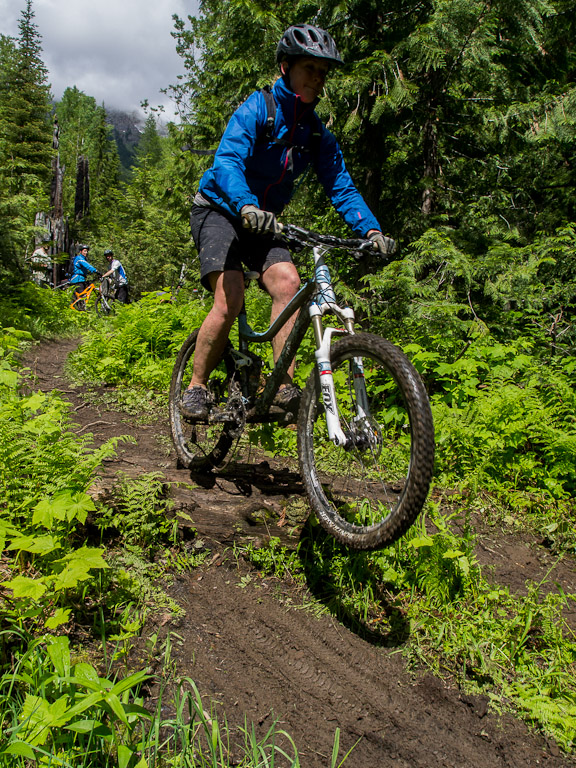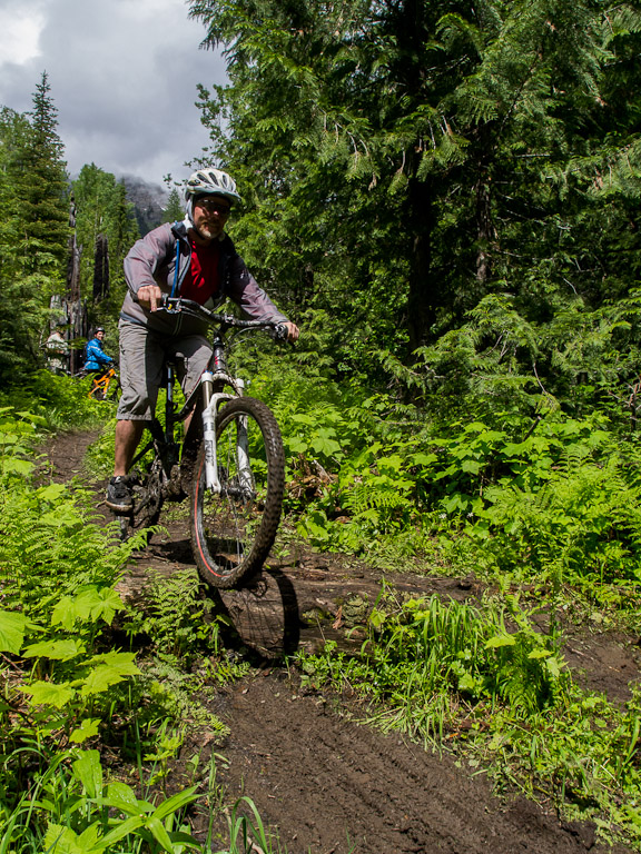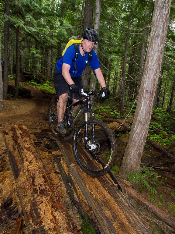 We went up to a local favourite, Project 9. A nice enough trail, but as is the theme in Fernie, a hard climb for a short descent. We spent a bunch of time on this little log practicing various strategies for getting over.
