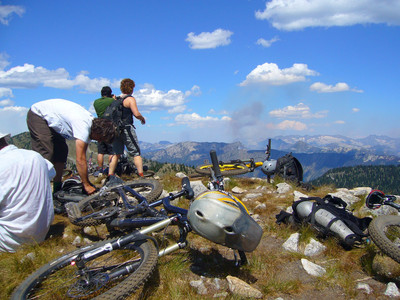 A nice littel view from the top. That smoke in the distance is a small forest fire burning in the West Kokanee Creek. As we sat up at the top we watched it jump the ridge into Springer Creek.